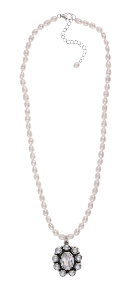 Freshwater Pearl and Cubic Zircon pendant set in Sterling Silver on Freshwater Rice Pearl Necklace.